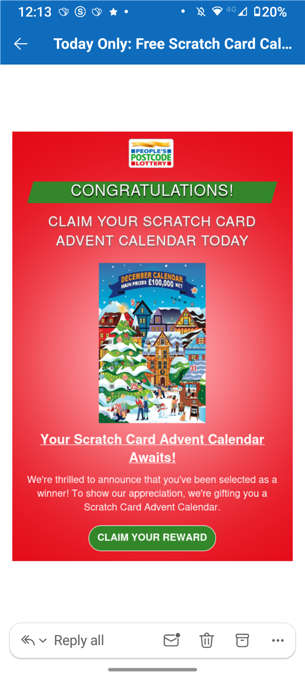 Please beware of an email that's doing the rounds again after last year. It claims to be for the People's Postcode Lottery and offers a free scratch card advent calendar. As is the way with these emails, the sender address is suspicious, and there are tell tale signs in the urgency it tries to use to get people to respond stating “today only” and “act now”. This is not a genuine offer and it's not from the People's Postcode Lottery. Please be wary of emails like this that offer large cash prizes. They often use brand names to try to add authenticity and rely on some people being signed up to the official service and assuming it's therefore legitimate. If you are not sure, stop, think fraud - especially when you are asked to make a payment or give your details.